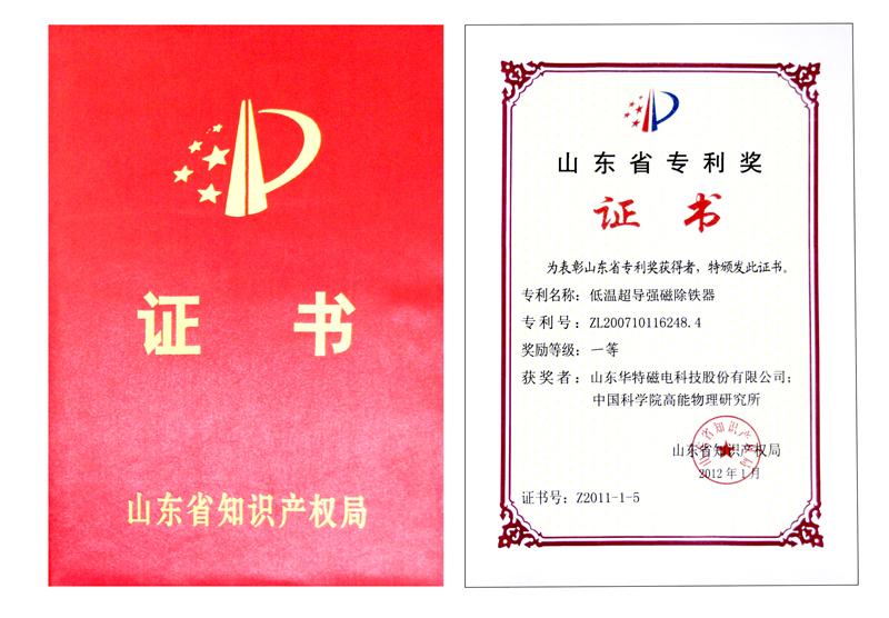 “低溫超導強磁除鐵器”榮獲山東省發明專利一等獎