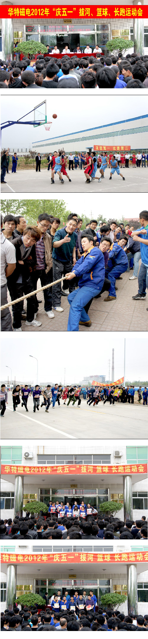 為慶祝五一國際勞動節(jié),4月30日,由公司工會、黨支部、團委組織的“華特磁電2012慶五一拔河、籃球、長跑運動會”如期舉行。此次活動分為籃球賽、拔河、長跑三個項目,運動會場上,各參賽選手精神飽滿,生龍活虎,奮勇爭先,比賽場面異常激烈,現(xiàn)場觀眾吶喊助威,呼聲此起彼伏,熱情高漲。經過三個小時的激烈角逐,比賽圓滿結束,公司領導為贏得比賽的優(yōu)手選手頒發(fā)獎品。