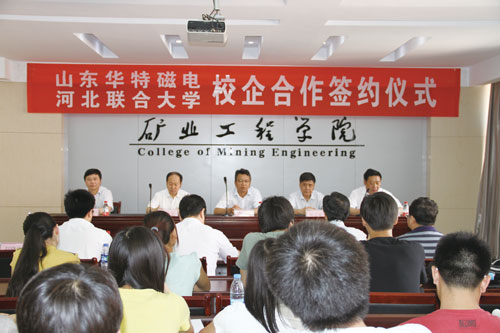 簽約儀式結(jié)束后,王兆連董事長介紹了公司基本情況和本人創(chuàng)業(yè)歷程,使學(xué)生深受鼓舞。常務(wù)副總裁兼技術(shù)中心總經(jīng)理劉風(fēng)亮針對目前國內(nèi)磁電選礦產(chǎn)品的技術(shù)及使用狀況做了專題報告,內(nèi)容豐富生動,使學(xué)生在學(xué)習(xí)選礦工藝的同時,了解生產(chǎn)現(xiàn)場實(shí)際使用的選礦設(shè)備,受到學(xué)院100 多參會師生的好評。