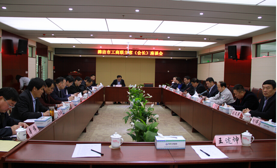 3月11日 下午濰坊市工商聯主席(會長)座談會在我公司二樓會議室隆重召開,濰坊市委統戰部副部長、市工商聯黨組書記胡立,臨朐縣副縣長王永剛、奎文區委統戰部副部長、區工商聯黨組書記韓素國,濰城區委統戰部副部長、區工商聯黨組書記徐記新,坊子區人大副主任、區工商聯黨組書記張廣從,臨朐縣寺頭鎮黨委書記瞿志敏、臨朐縣委統戰部副部長、工商聯黨組書記陳仁增等各縣市區工商聯負責人及工商聯部分企業家出席本次座談會。