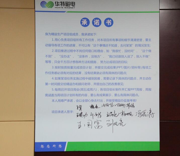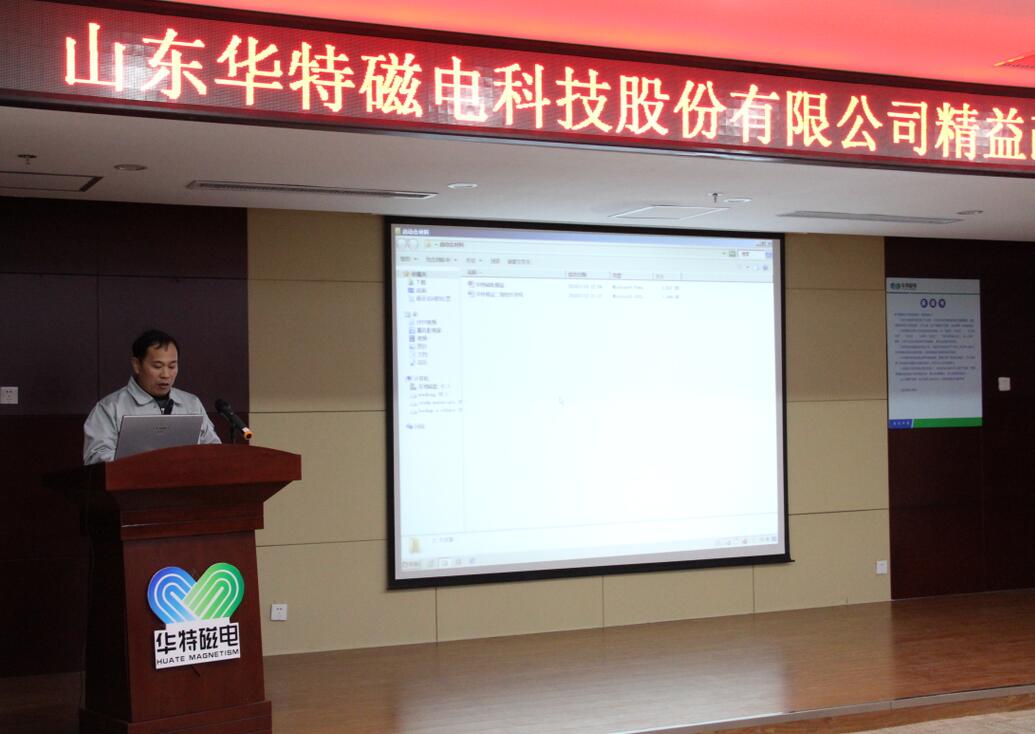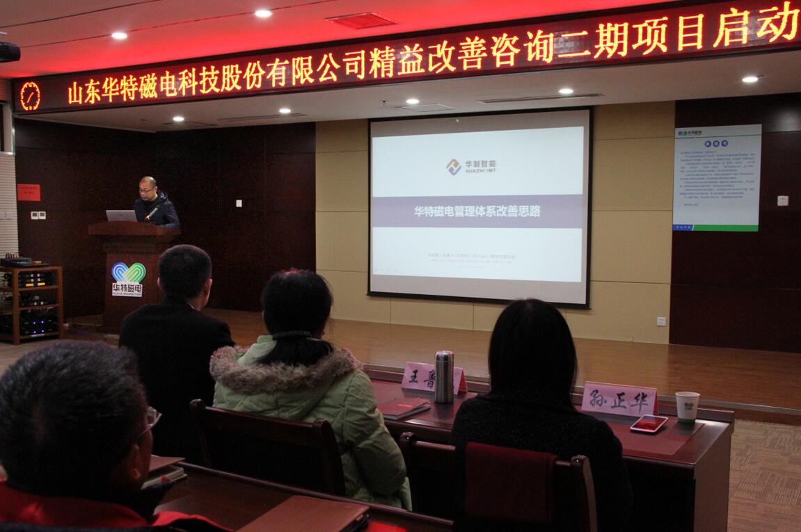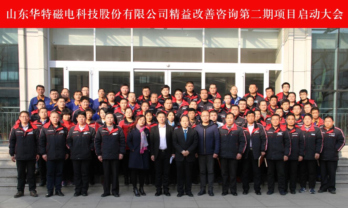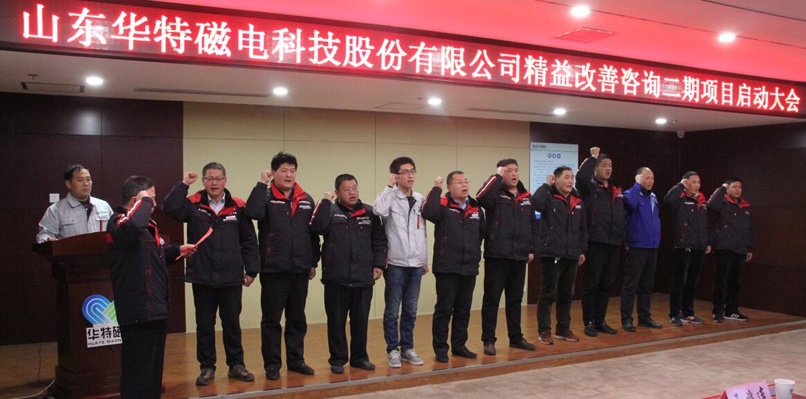 2018年1月14日,為進(jìn)一步提升山東華特磁電科技股份有限公司管理水平,增強(qiáng)公司競爭力,實(shí)現(xiàn)企業(yè)高速發(fā)展,公司組織召開了精益生產(chǎn)二期項(xiàng)目的簽約、啟動儀式和誓師大會。公司董事長兼總裁王兆連、山東華制智能制造技術(shù)有限公司項(xiàng)目總監(jiān)王樹功、項(xiàng)目經(jīng)理王金泉等四位專家出席會議,公司常務(wù)副總裁劉風(fēng)亮、高級副總裁劉梅、副總裁兼精益辦主任王建波、各部門負(fù)責(zé)人以及主管級以上領(lǐng)導(dǎo)參加會議。