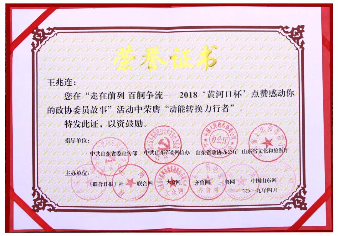 王兆連董事長在“走在前列 百舸爭流——2018‘黃河口杯’點贊感動你的政協(xié)委員故事”活動中榮膺“動能轉(zhuǎn)換力行者”